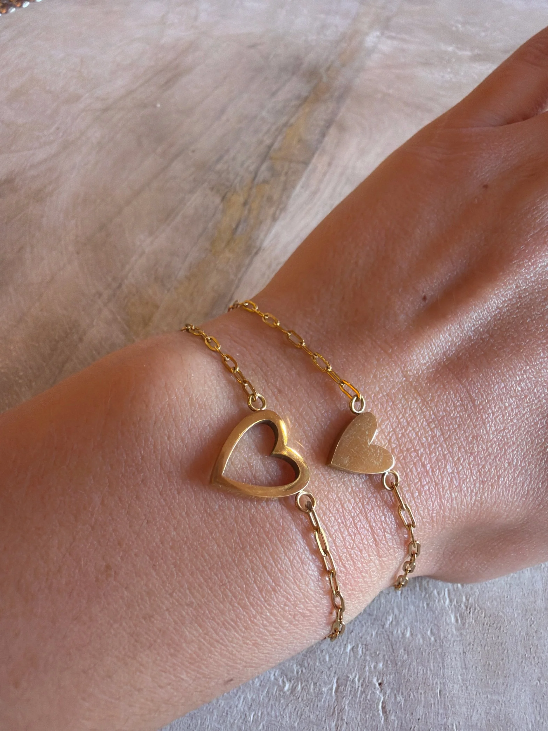 Shop › Big heart little heart bracelet Image 1 of 4 Image 2 of 4 Image 3 of 4 Image 4 of 4 Big heart little heart bracelet $30.00 Heart style: Big open heart Little closed heart Add To Cart Added!