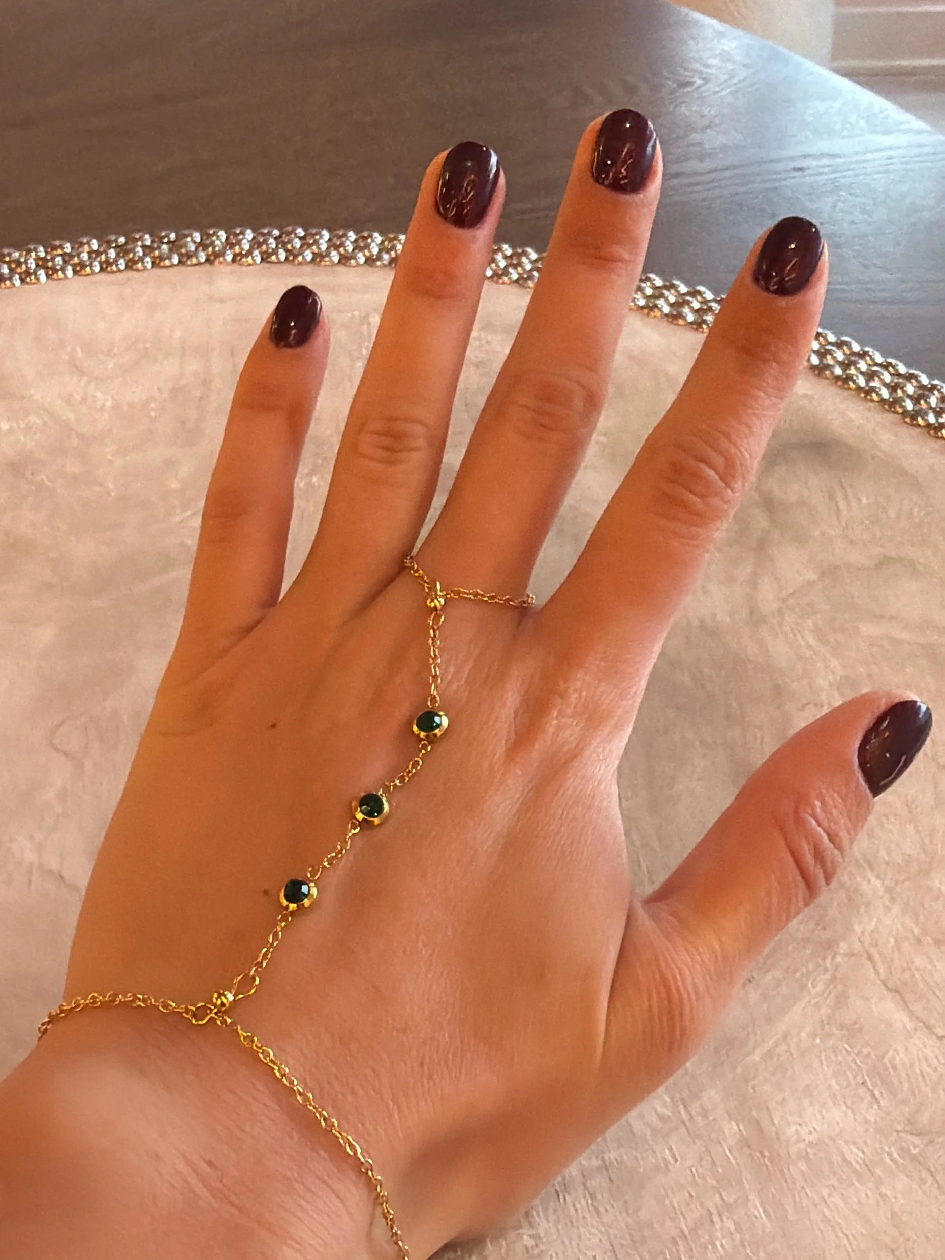 Shop › Green stone hand chain Image 1 of 4 Image 2 of 4 Image 3 of 4 Image 4 of 4 Green stone hand chain $30.00 Add To Cart Added!